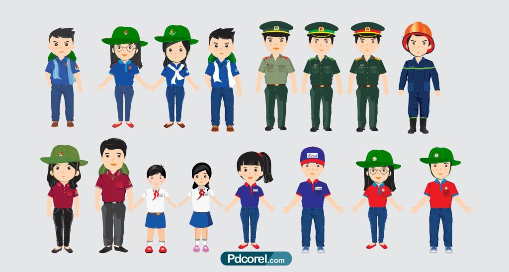 vector ảnh chibi đoàn thanh niên, chibi học sinh đeo khăn quàng, chibi chú công an